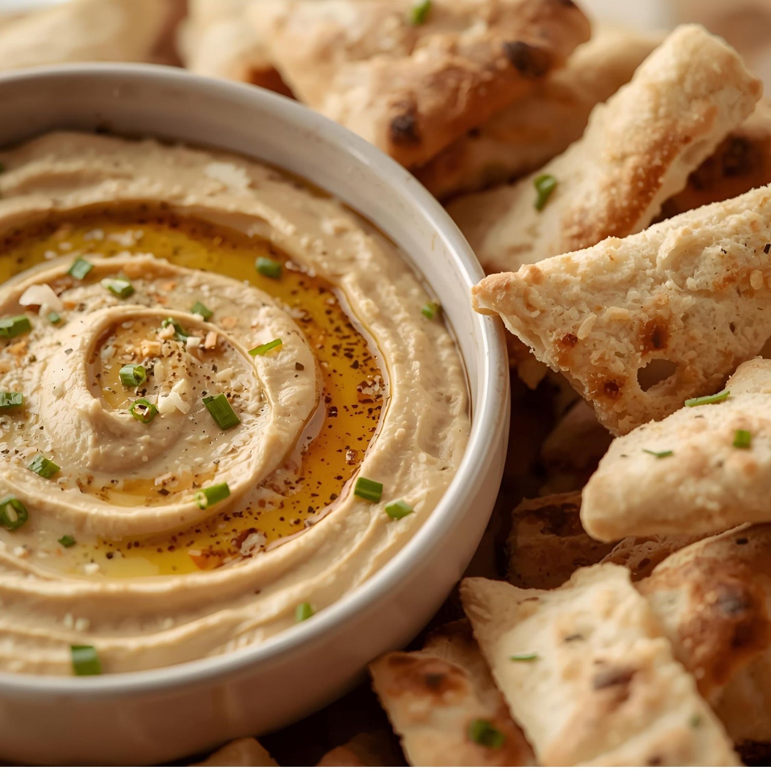 - Mediterranean mezze bowls with a neutral-coloured theme - hummus, white bean dip, soft pitta triangles & olives.