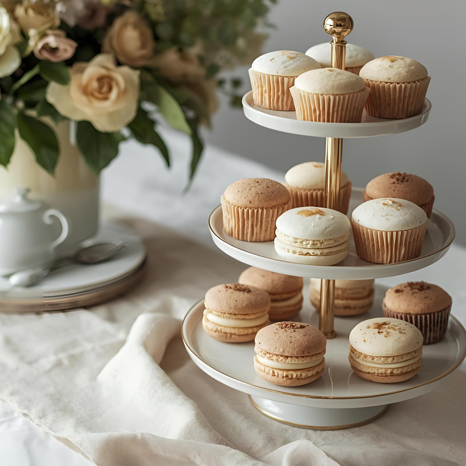 - Mini scones with clotted cream and jam, served on tiered stands with gingham or floral napkins.