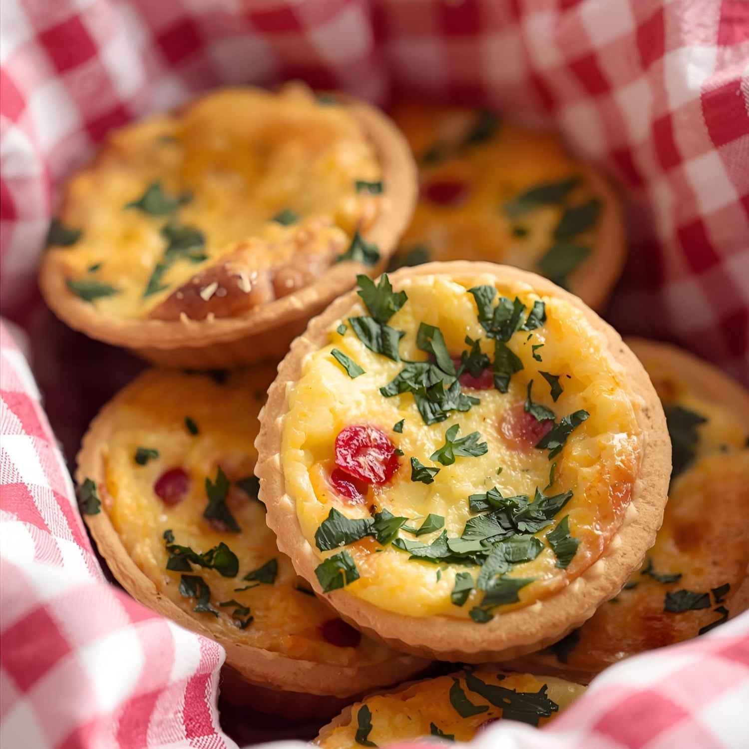 - Mini crustless quiches - classic flavours of cheddar & chive, spinach & mushroom, ham & leek. Served warm or room temperature, displayed in a wicker basket lined with gingham napkins for a storybook feel.