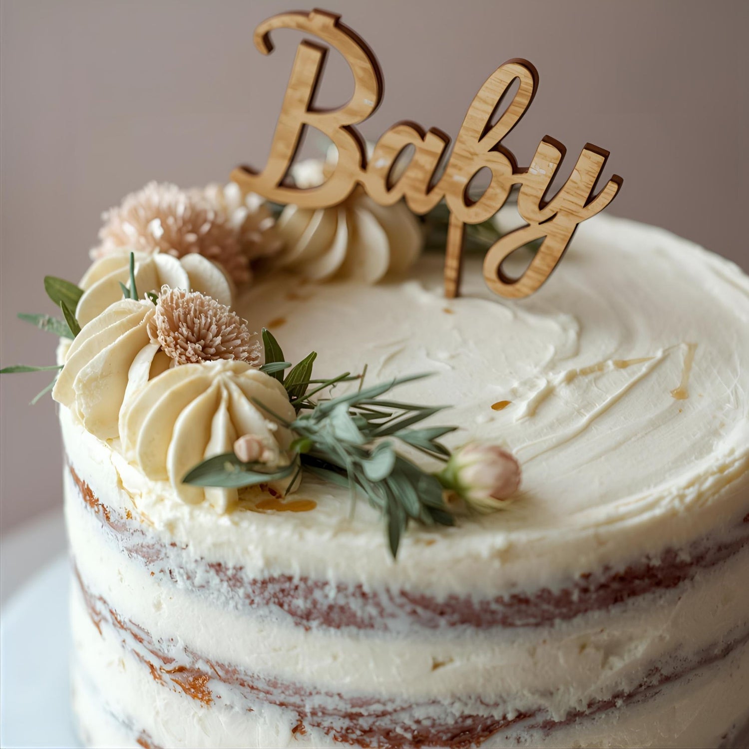 Fluffy vanilla sponge with a white chocolate buttercream and a thin caramel swirl between the layers. Decorate with a few sprigs of food-grade greenery/dried flowers which gives a natural, gentle look. A nice finishing touch is a wooden ‘Baby’ topper.