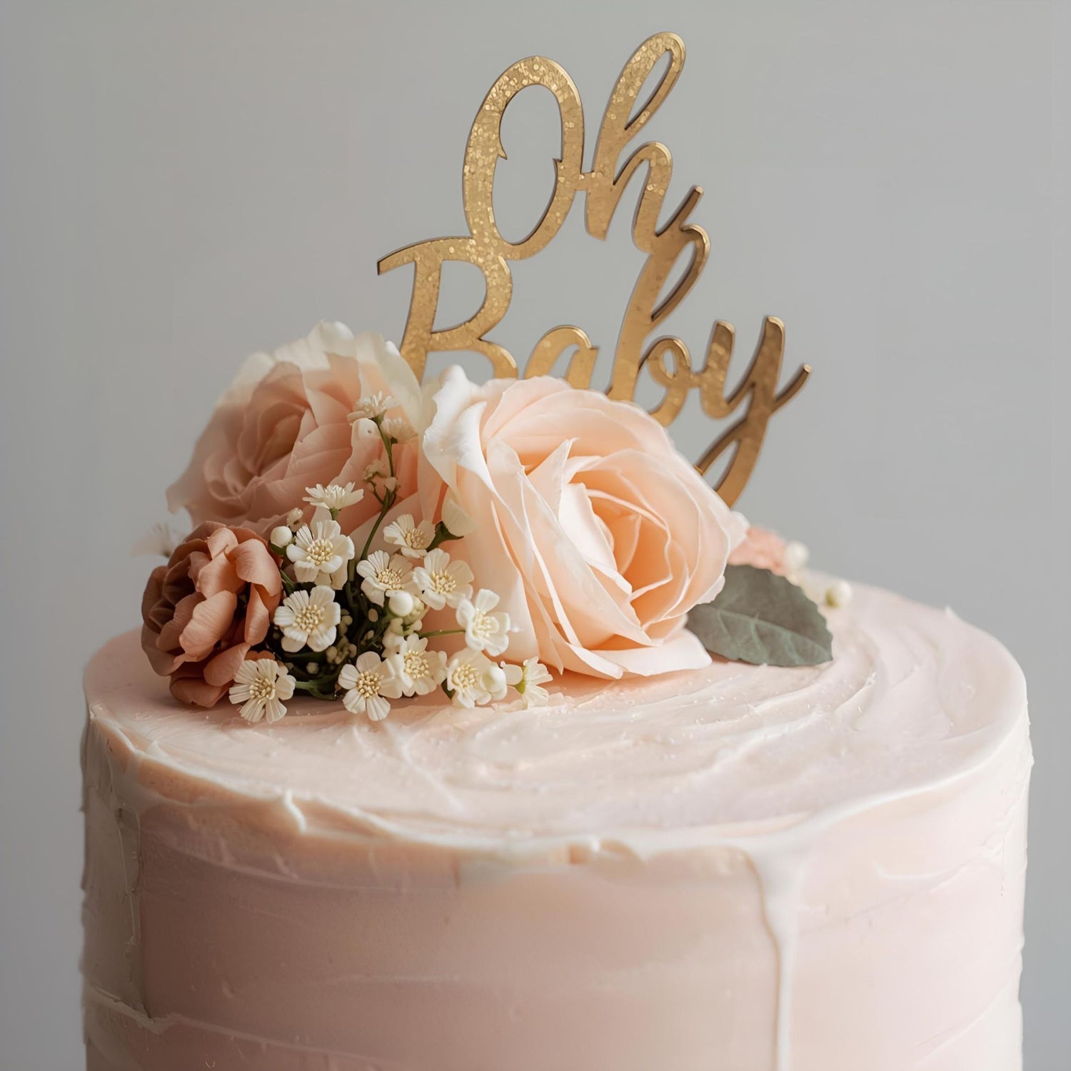 A simple vanilla or strawberry sponge covered in pale pink buttercream works beautifully as an attractive centrepiece. A smooth buttercream finish with a few fresh flowers (roses or edible pansies work well) keeps it elegant without feeling overly decorated. A small cake topper such as ‘Oh Baby’ in gold or wooden tones adds a lovely finishing touch.
