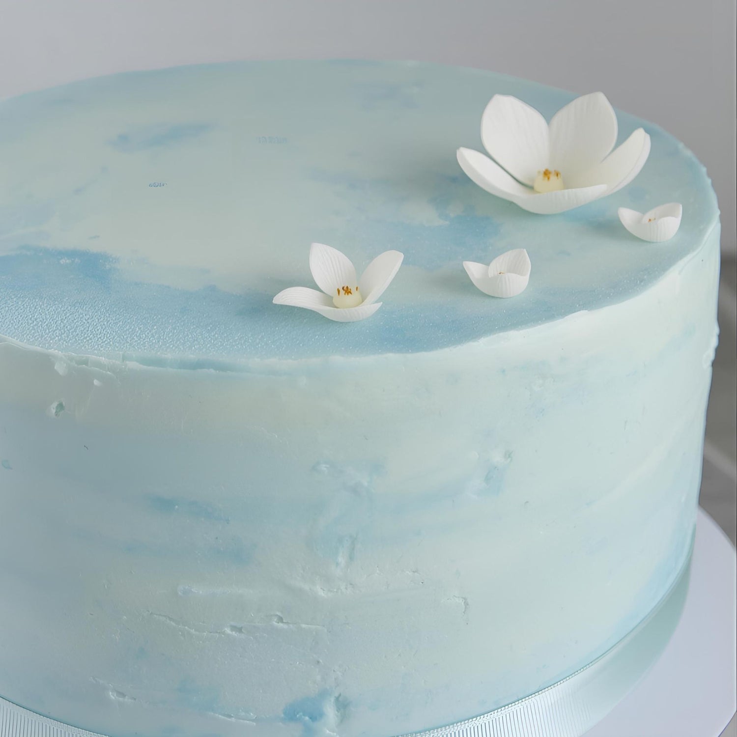 A light and classic option is a vanilla Victoria sponge cake with pale blue buttercream and a soft watercolour effect in blue and white. Adding a few white flowers made of sugar icing and a simple ribbon around the base keeps things understated and pretty.