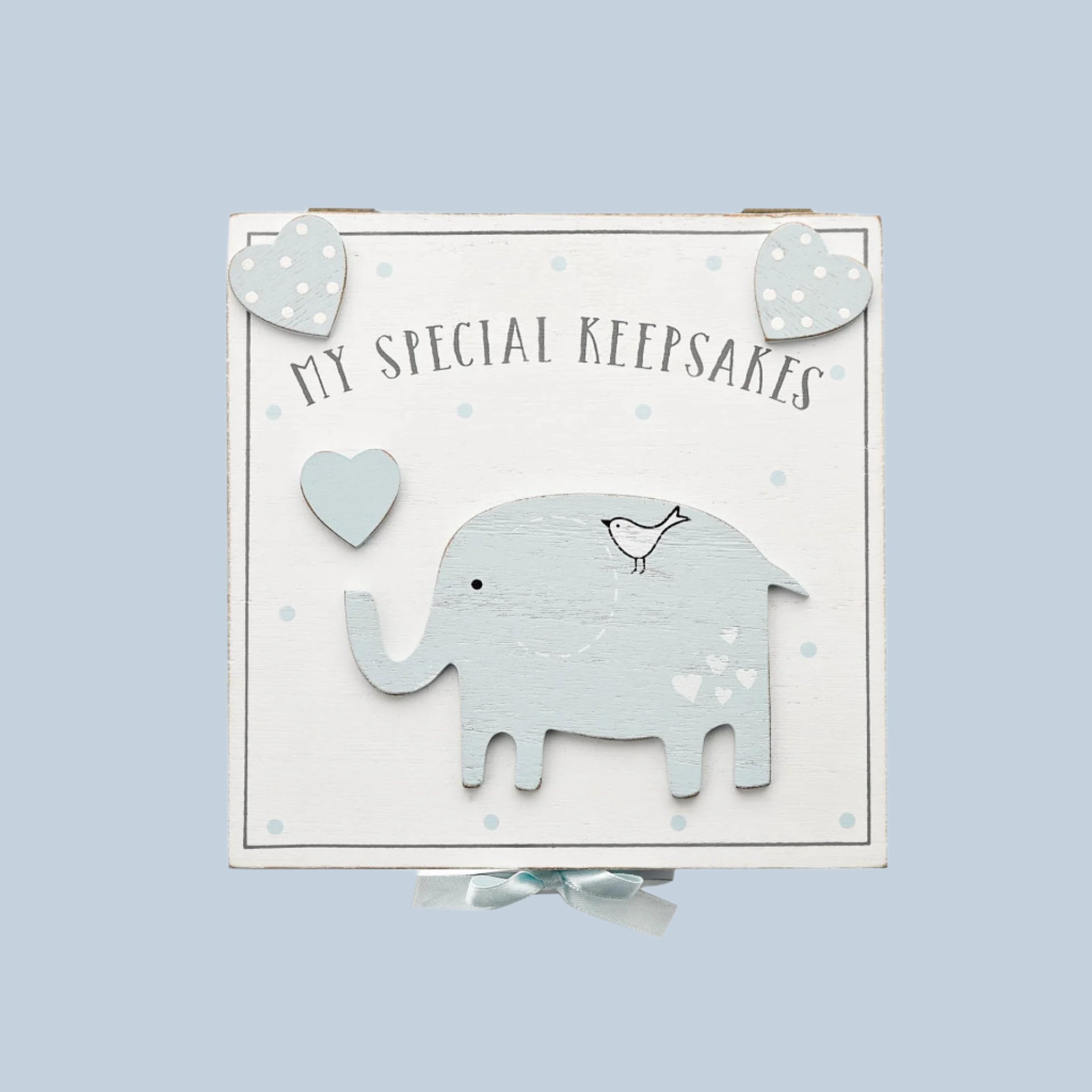 'My Special Treasures' wooden baby boy keepsake box is the perfect place to store baby photos, new baby cards, hospital bracelets and other early keepsakes. Made with distressed wood, a cute 3D elephant design, with blue polka dots and a 'Mummy & Daddy love me' heart-shaped clasp with blue satin ribbon.