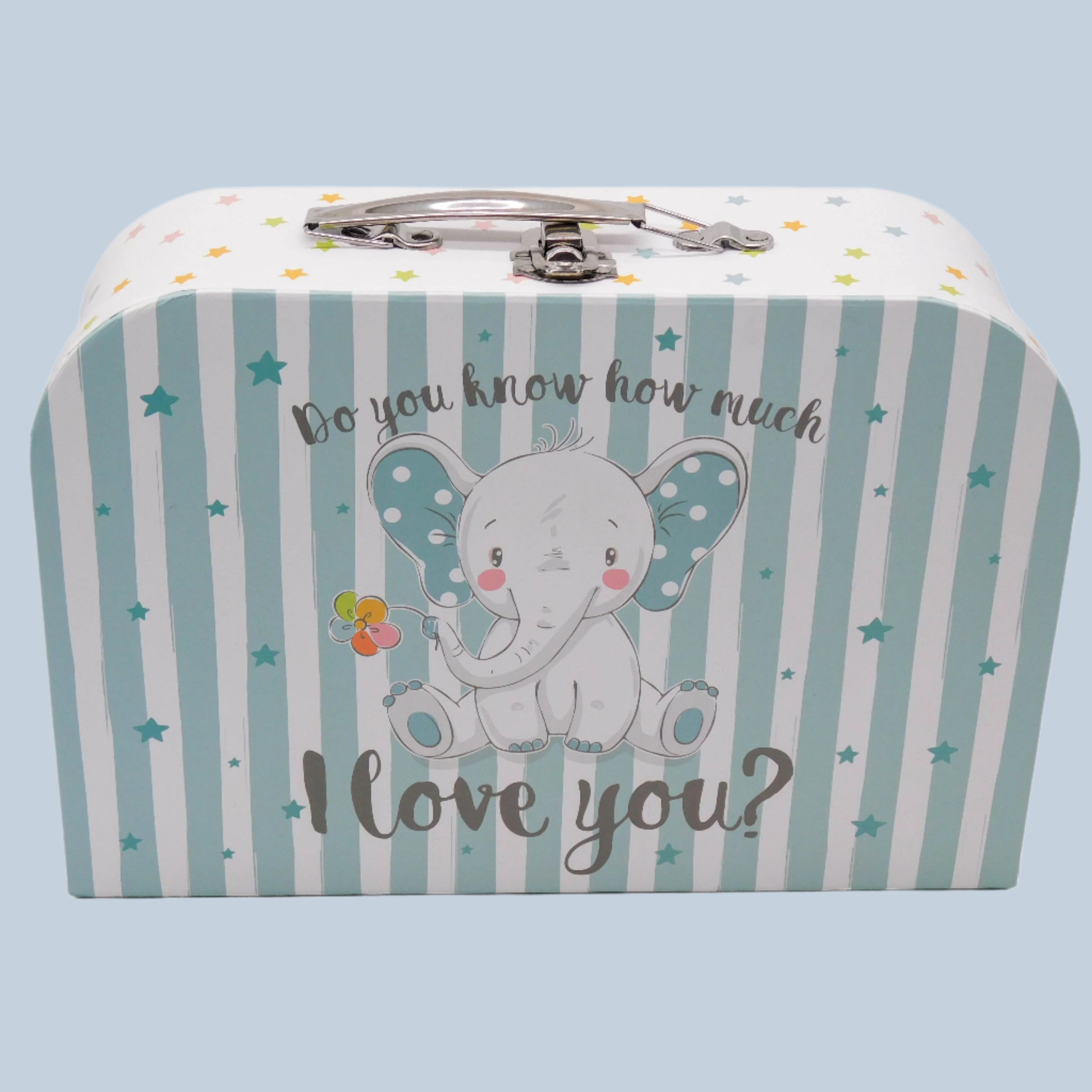 A lovely collection of baby essentials and toys in a blue elephant keepsake box with the wording 'Do you know how much I love you?'