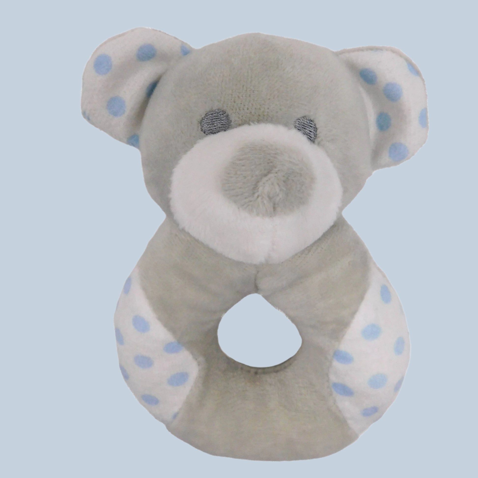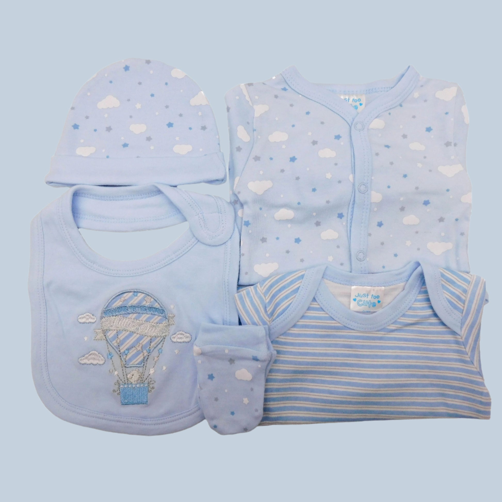 A 7-piece blue layette, including sleepsuit, bodysuit, hat, bib, mittens and washcloths; An Elephant Comforter with teethers, suitable from birth; A Teddy rattle, suitable from birth; A Blue cotton cellular blanket, Blue Cotton bootees.